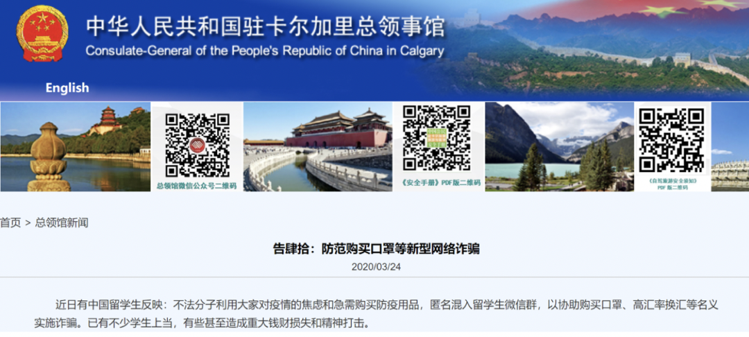 加拿大:驻卡尔加里总领馆提醒注意防范购买口罩等新型网络诈骗