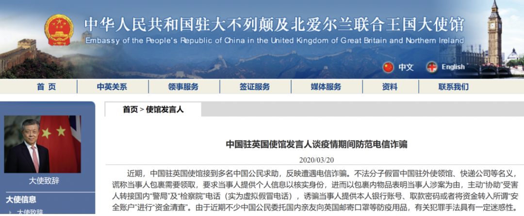 英国:驻英国大使馆提醒疫情期间注意防范电信诈骗