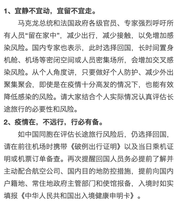 法国:驻法国大使致信同胞建议疫情在不远行
