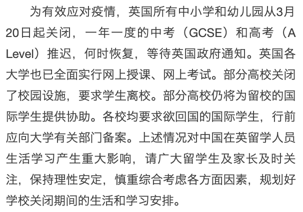 英国:学校关闭中高考推迟 驻英国大使馆提醒留学生做好学习安排