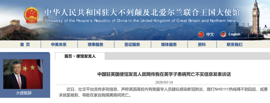 英国:中国留学生求医被拒在家隔离死亡?驻英国大使馆提醒不信谣不传谣