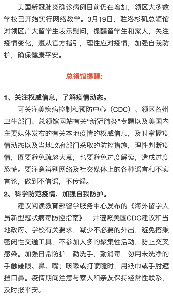 美国:驻洛杉矶总领馆醒留学生加强自我防护 妥善应对疫情