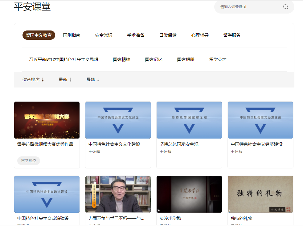 在“平安课堂”频道中,设有爱国主义教育、国别指南、安全常识、学术准备、日常保健、心理辅导、留学服务等七大板块,目前已上线300多个课件。其中,爱国主义教育课程包括“中国特色社会主义文化”“坚持总体国家安全观”等内容。