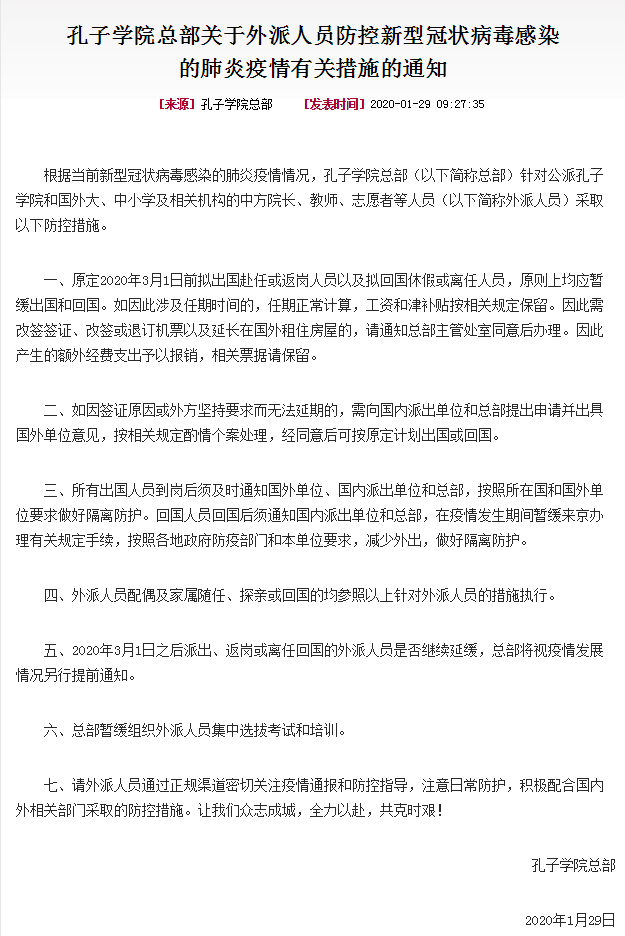 根据当前新型冠状病毒感染的肺炎疫情情况,孔子学院总部(以下简称总部)针对公派孔子学院和国外大、中小学及相关机构的中方院长、教师、志愿者等人员(以下简称外派人员)采取以下防控措施。详情如下,请通知本单位相关人员知晓: