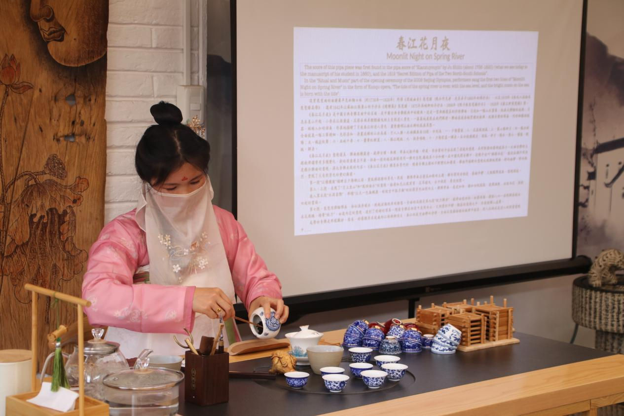 试穿完中国传统服饰,茶艺师张静进行了茶文化讲解和茶道表演,随后邀请学生们品茗。不少学生表示这是他们第一次了解到传统茶艺的冲泡步骤,觉得十分新奇,纷纷凑近了观察茶叶的形状、体验茶叶的味道。
