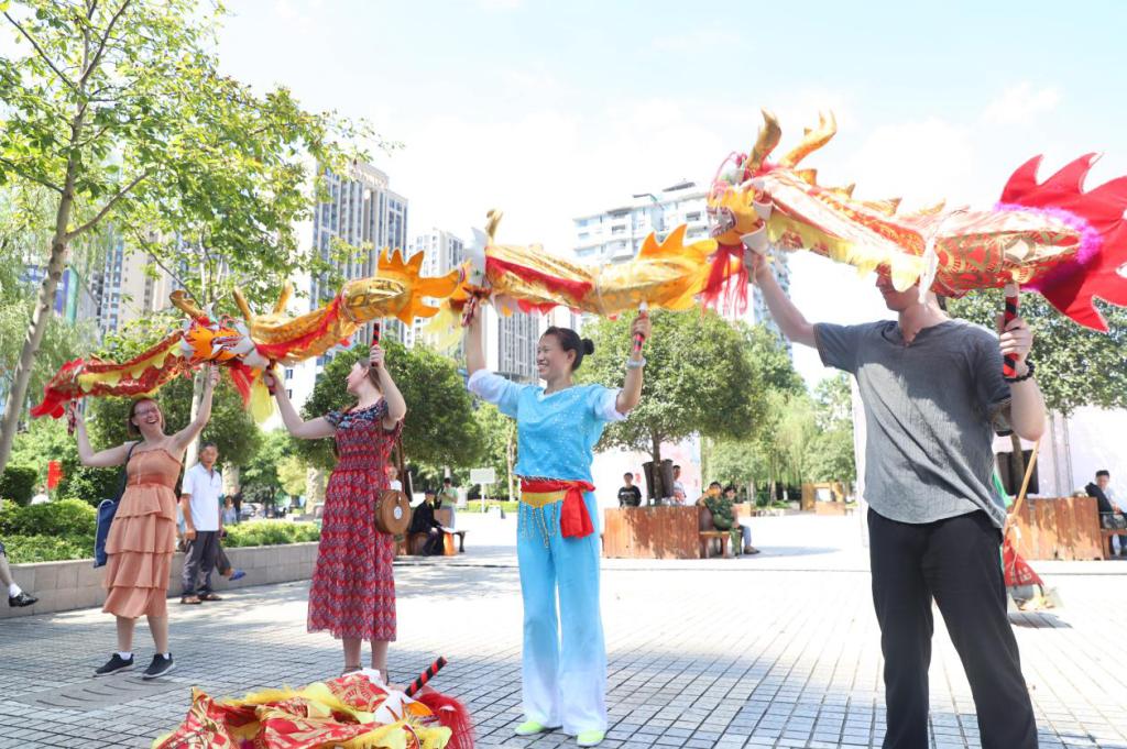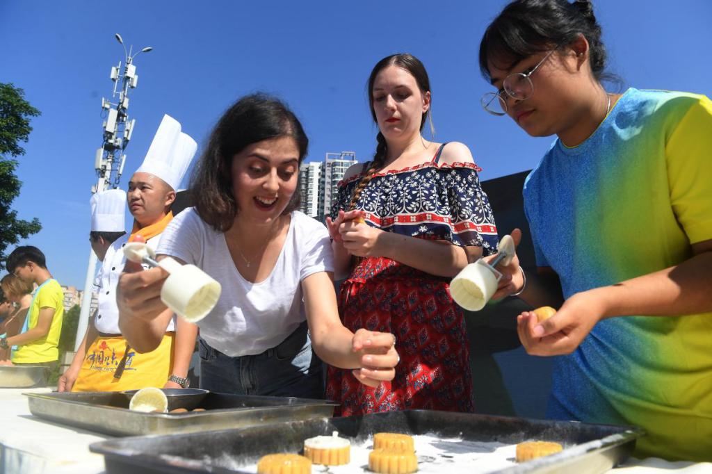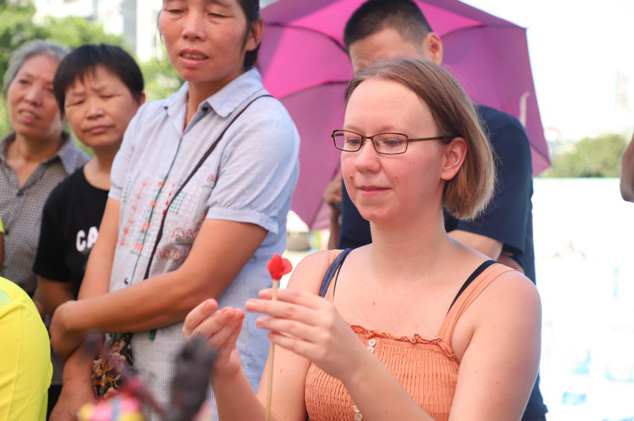 2019年9月11日上午,我校5名外教应邀参加由重庆市委宣传部、市文化和旅游发展委员会、巴南区委、区人民政府主办,在巴南区人民广场举行的“行千里同享花好月圆 致广大共促文明互鉴”-2019中秋•老外@Chongqing体验非遗活动。