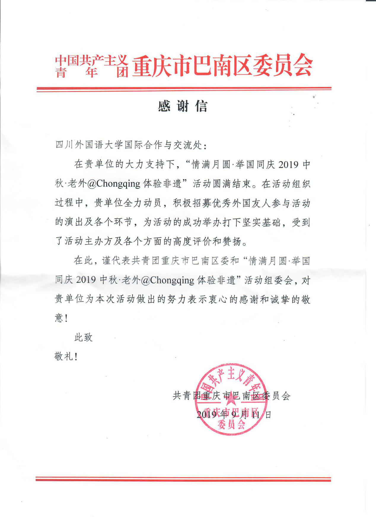 活动后,共青团巴南区委给我校国际处致函,感谢我校对此次活动的支持。