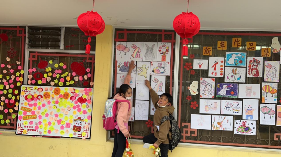 学生在“新年许愿墙”和“作品展示集”合影留念