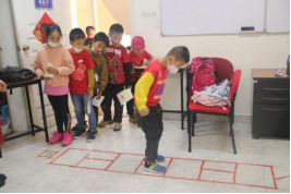 学生体验中国民间传统游戏“跳格子”、“蒙眼敲锣”、“套圈”