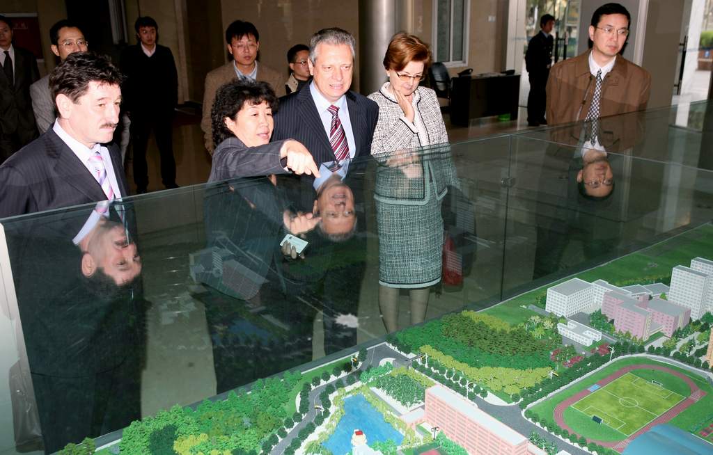 李建平副校长为罗马尼亚大使展示校园沙盘