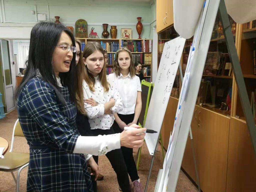 下诺夫哥罗德语言大学孔子学院派出两名老师参加此次活动。王媚老师给大家介绍了“造字圣人”仓颉,还为他们讲解了基础汉字的起源和构成,比如:山、木、水、火、雨、人、日、月、林、休等并示范汉字的写法。在结合图片讲解的过程中,学生都能快速而准确地猜出对应的汉字,并积极上台写汉字。陈春红老师为大家播放了《象形文字》视频和汉语歌,使大家对汉字有了更直观形象的了解。通过短短几分钟的学习,参会者对于汉字、汉语都有了初步的认识,而且给他们留下了一个良好的印象——汉语并不难学。