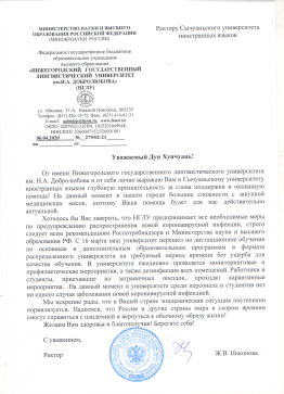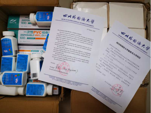 学校积极筹措防疫物资,第一时间组织向下诺夫哥罗德国立语言大学寄送1000只口罩,向洛美大学寄送1000只口罩,1000副手套和20瓶消毒片剂,随同寄送的还有校长董洪川的慰问信。