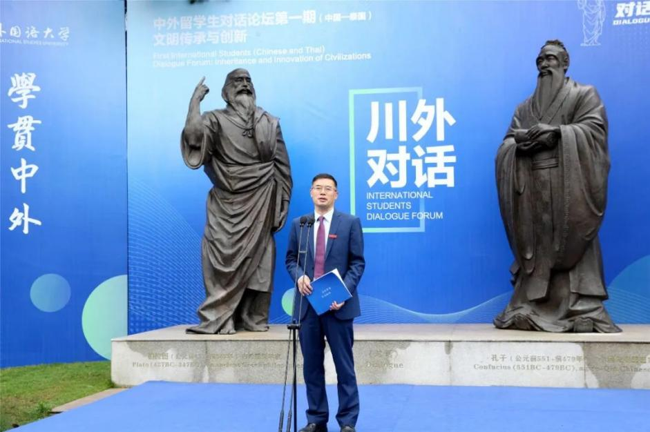 今天上午,9728太阳集团中外留学生对话论坛启动仪式暨第一期(中国—泰国)对话论坛在太阳广场“对话”雕塑前举行。