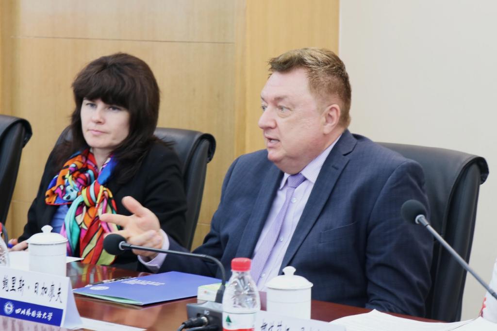 5月7日下午,俄罗斯下诺夫哥罗德国立语言大学(下语大)校长鲍里斯·日加廖夫(Boris Zhigalev),对外俄语中心负责人娜塔莉亚·马克尚釆娃(NataliiaMakshantseva),教学科研中心负责人玛雅·皮利波维奇(Mzyya Pilipovich)、孔子学院外方院长安德烈·班科夫(Andrey Bankov)、中方院长姚霞一行赴川外参加下语大孔子学院第八届理事会。理事会在西区行政楼A301会议室举行。双方就孔子学院的工作和教学情况进行探讨,并就继续深化两校合作做出一系列的规划和期望。李克勇校长主持本次会议。