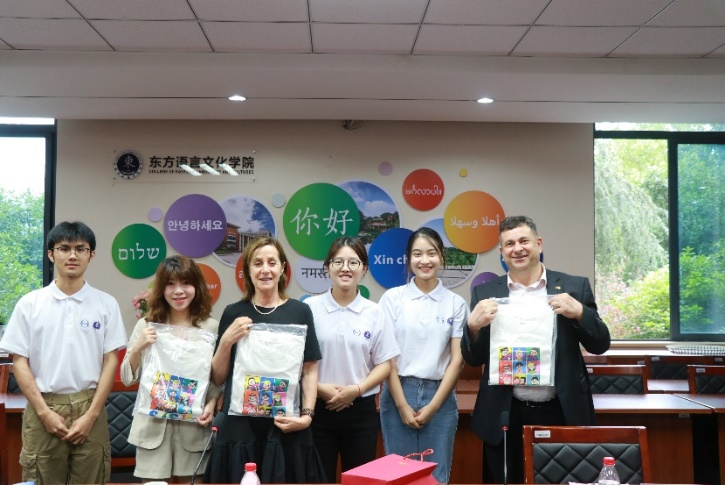 座谈结束后,潘绮瑞一行前往东方语言文化学院与希伯来语专业师生交流,观看了由希伯来语专业学生带来的希伯来语诗朗诵。在交流环节,潘绮瑞大使以自己学习中文的经历鼓励在场的希伯来语专业学生坚持学习。她向学生了解他们学习方面的困难,并分别给出了学习建议。东方语言文化学院副院长 吴昊表示,川外的学生正在向中国讲述以色列的故事、传播以色列的文化,期待他们走出国门,向以色列讲述我们中国的故事。
