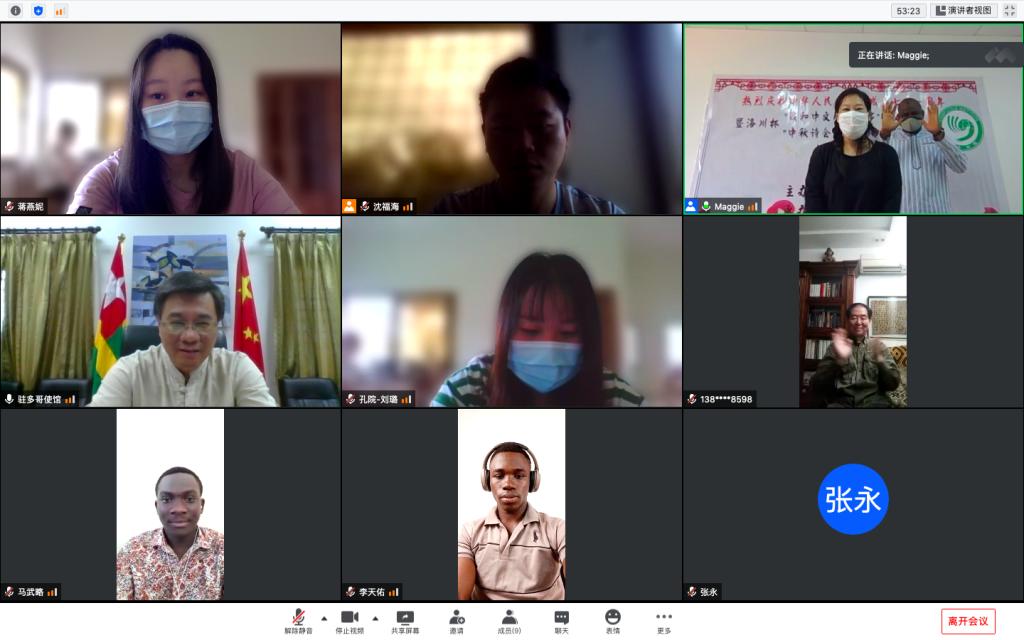 2020年9月29日,由中国驻多哥大使馆主办,洛美大学孔子学院承办的迎国庆,庆中秋暨洛川杯“我和中文那点事儿”征文大赛和“中秋诗会”中文诗歌朗诵大赛的颁奖典礼在线上隆重举行。