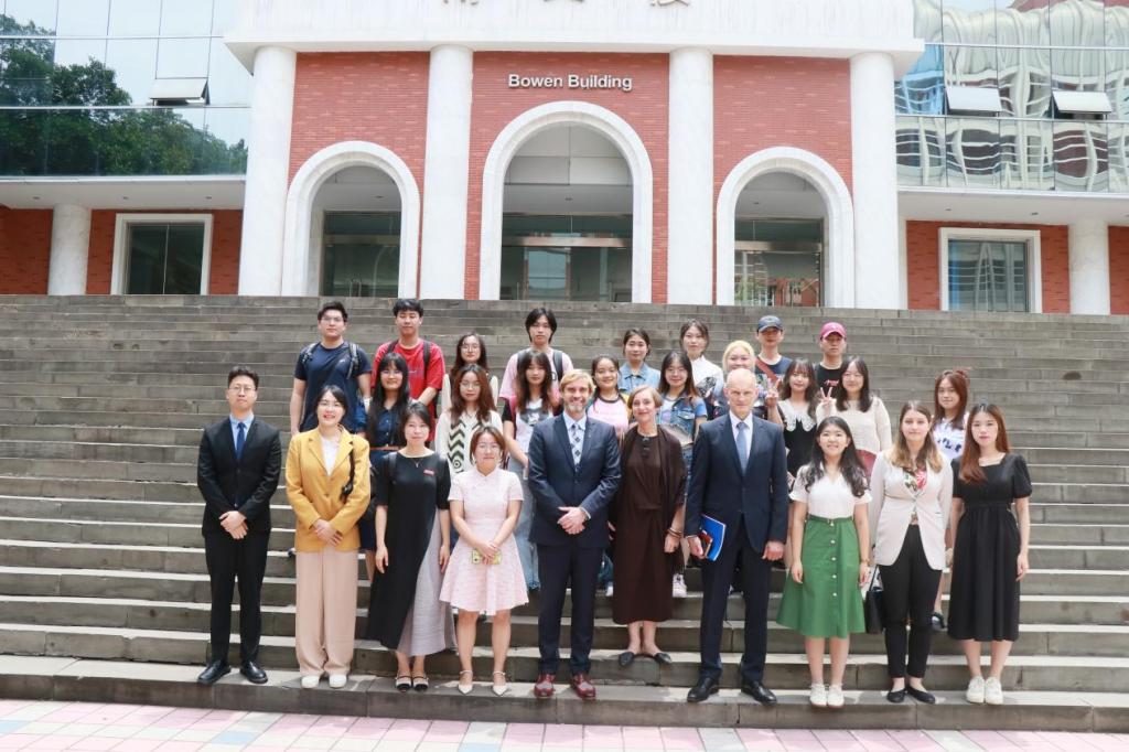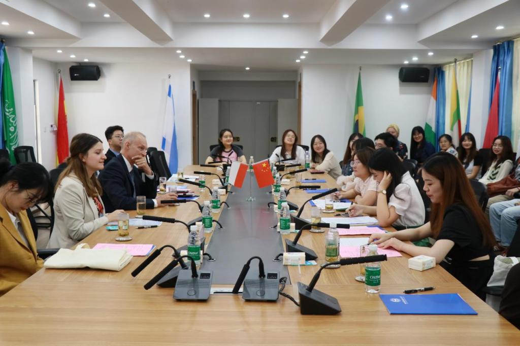 随后,赛熙军大使一行与我校西方语言文化学院波兰语专业师生就专业未来发展、学生留学波兰情况、实习就业等进行了友好交流。西方语言文化学院波兰语外教Izabella Kalutabiao分享了在我校一直以来的工作经历,并表达了对川外及其教学工作的热爱。