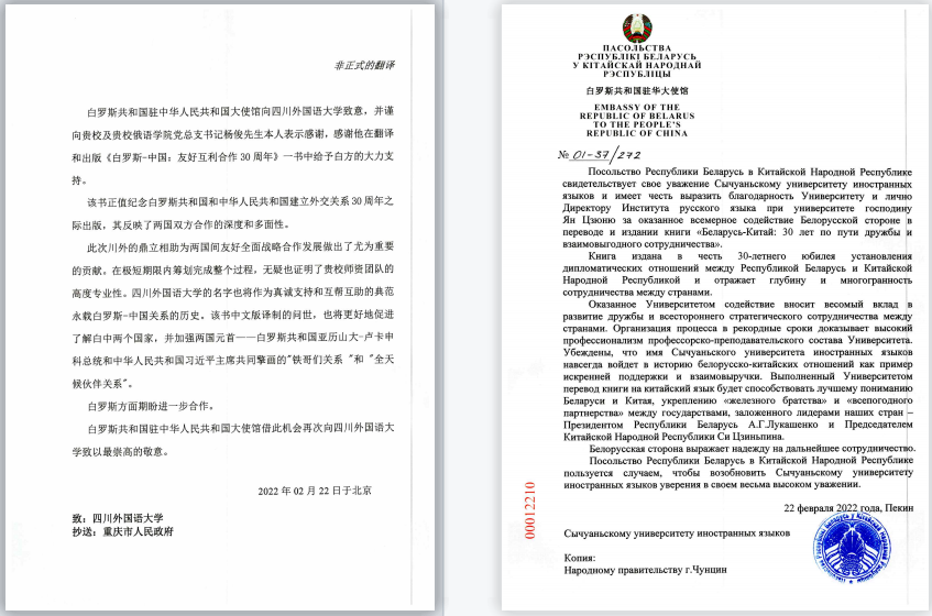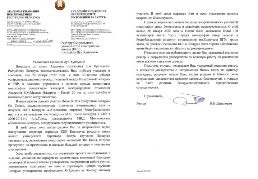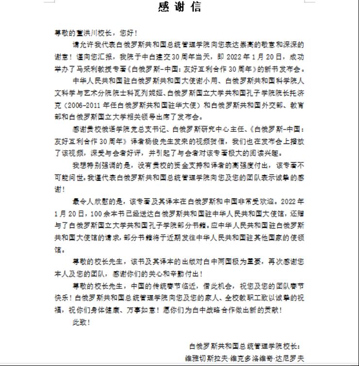 我校收到白俄罗斯共和国驻华大使馆、白俄罗斯共和国总统管理学院发来的感谢信,感谢我校及白俄罗斯研究中心主任杨俊为中白交流做出的特殊贡献,特别致谢杨俊教授在翻译和出版《白罗斯-中国:友好互利合作30周年》一书中所给予的辛勤付出。