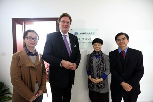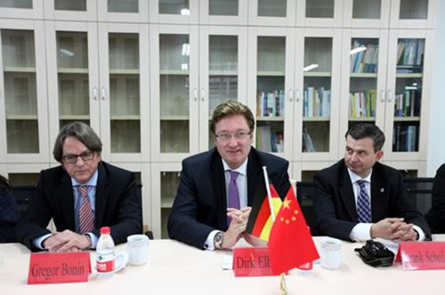 11月1日中午,李克勇校长在博文楼二楼会议室会见了德国杜塞尔多夫市市长迪克·艾博思(Dirk Elbers)及其代表团一行,包括杜塞尔多夫市城市建设与规划局局长格奥格·博宁博士(Dr.Gregor Bonin)、杜塞尔多夫展览有限公司首席执行官韦尔纳·多恩赛特先生(Werner M.Dornscheidt)、杜塞尔多夫市市长办公室主任弗兰克·硕尔茨先生(Frank Scholz)、杜塞尔多夫市对外交流部主任娜塔莉亚·费多森科女士(Natalia Fedossenko)和杜塞尔多夫市国际商务服务处处长安内特·克雷科思女士(Annette Klerks),重庆外侨办欧洲处处长李明全陪同出席。副校长乐勇、海涅研究中心主任冯亚琳、德语系主任李大雪、留学生部主任张泽民、国际合作与交流处副处长马驭骅参加会谈。