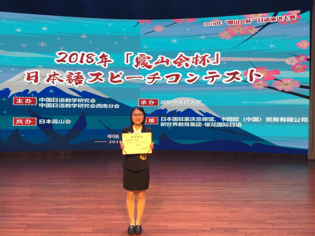 11月3日,2018年“霞山会杯”日语演讲大赛在成都中医药大学隆重举行,我系2015级同学何玲代表我校参加比赛。在命题演讲和即席演讲两轮角逐中,何玲均以出色的表现,稳定的发挥获得第一名的好成绩,并获得了“霞山会”提供的为期8天,到日本进行文化体验的机会。