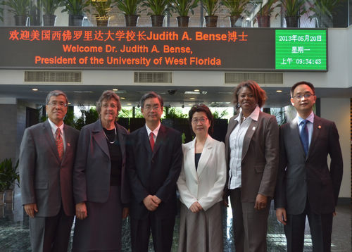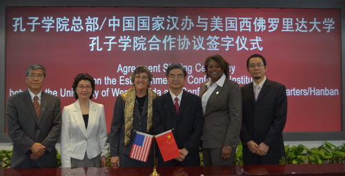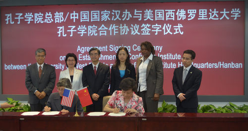 2013年5月20日,孔子学院总部与我校合作伙伴美国西佛罗里达大学正式签署合作设立孔子学院协议,我校校长李克勇、副校长李建平、留学生部主任张泽民出席签字仪式。