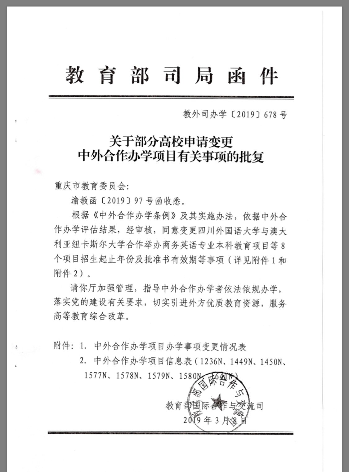 On March 8, Ministry of Education agreed the change of the starting and ending year and validate the approval letter of undergraduate educational project for business English major between Sichuan International Studies University and Newcastle University, Australia. The starting and ending year of the cooperation project is extended to 2022. The validity of the aproval letter is extended to December 31, 2026. In 2019, SISU will resume the Chinese-foreign cooperation project with the “3+1” school-running model.