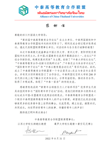 On September 6, 2022, SISUreceived a thank-you notefrom Alliance of China-Thailand Universities, which extended their gratitudesfor selecting student Wu Shiruito participate in the 4th Forum of China-Thailand Higher Education Cooperation - International Youth Forum and delivera keynote speech.
